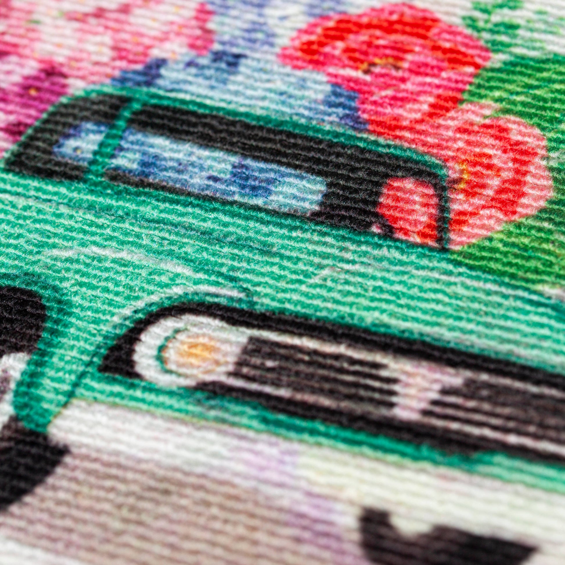 This textured sassafras switch mat features a "Welcome" message with a green vintage truck delivering colorful spring flowers.